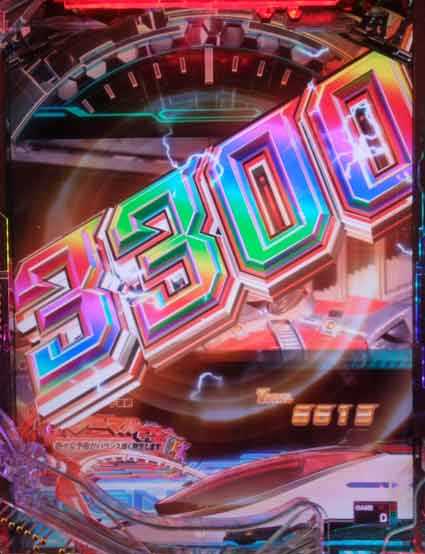 ランクアップ型の告知演出。デンライナーギミックが作動するたび、獲得出玉が上乗せされていく。