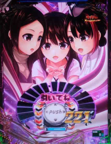 3回のボタンPUSHで出玉を上乗せしていく。下部のヒロインパネルが赤だと大量出玉獲得のチャンス。