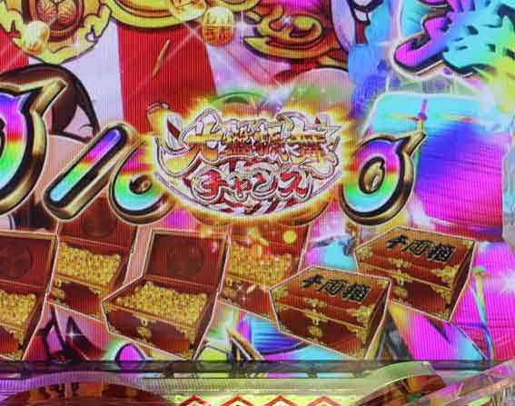 ラウンド中に液晶下部の宝箱アイコンから「大盤振舞チャンス」のロゴが飛び出すと上乗せのチャンス到来。