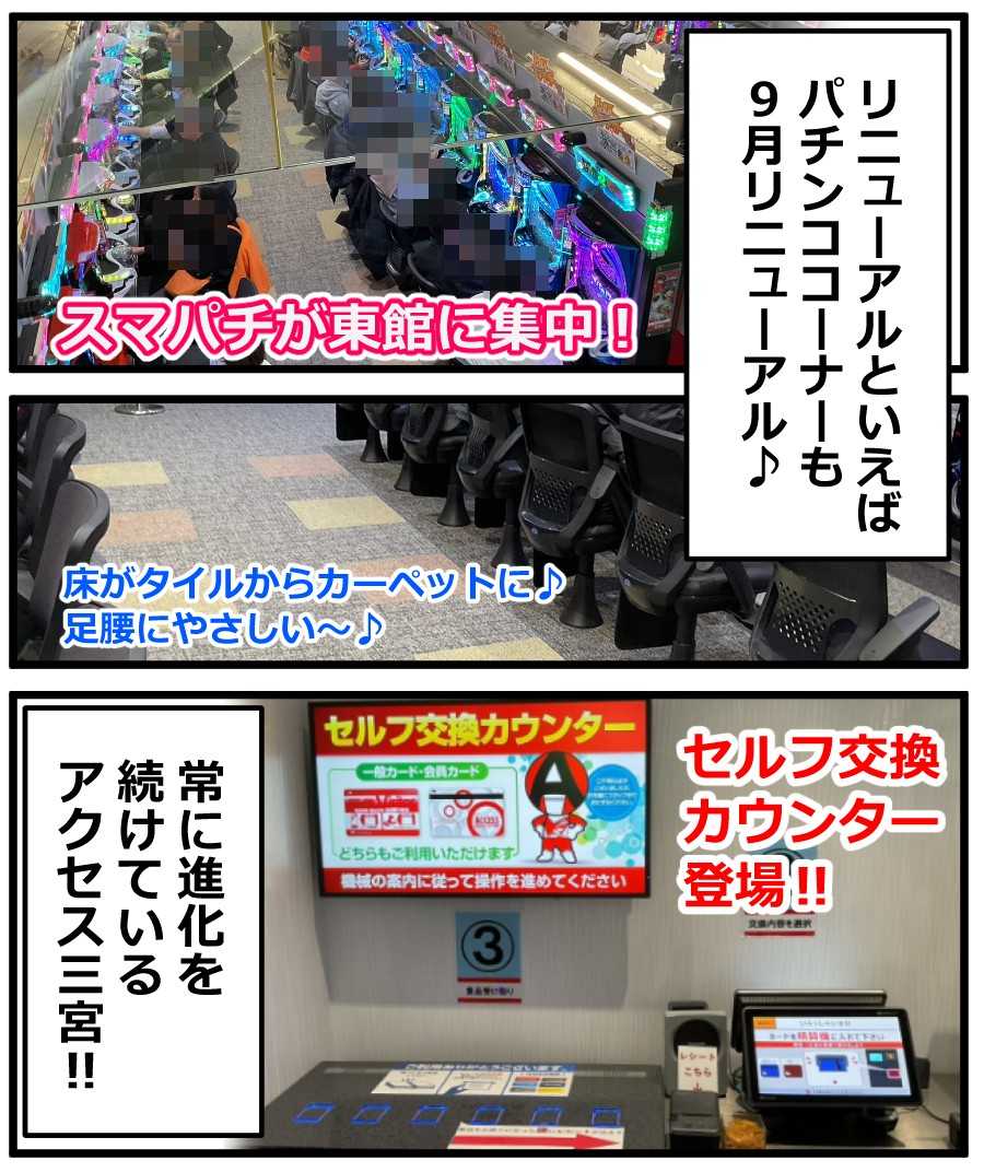 | 設備 | パチンコ全台パーソナル方式! 喫煙ルーム各階各所にあり! 女性専用喫煙ルームあり! 食事処はホール近くに沢山あるので安心! |