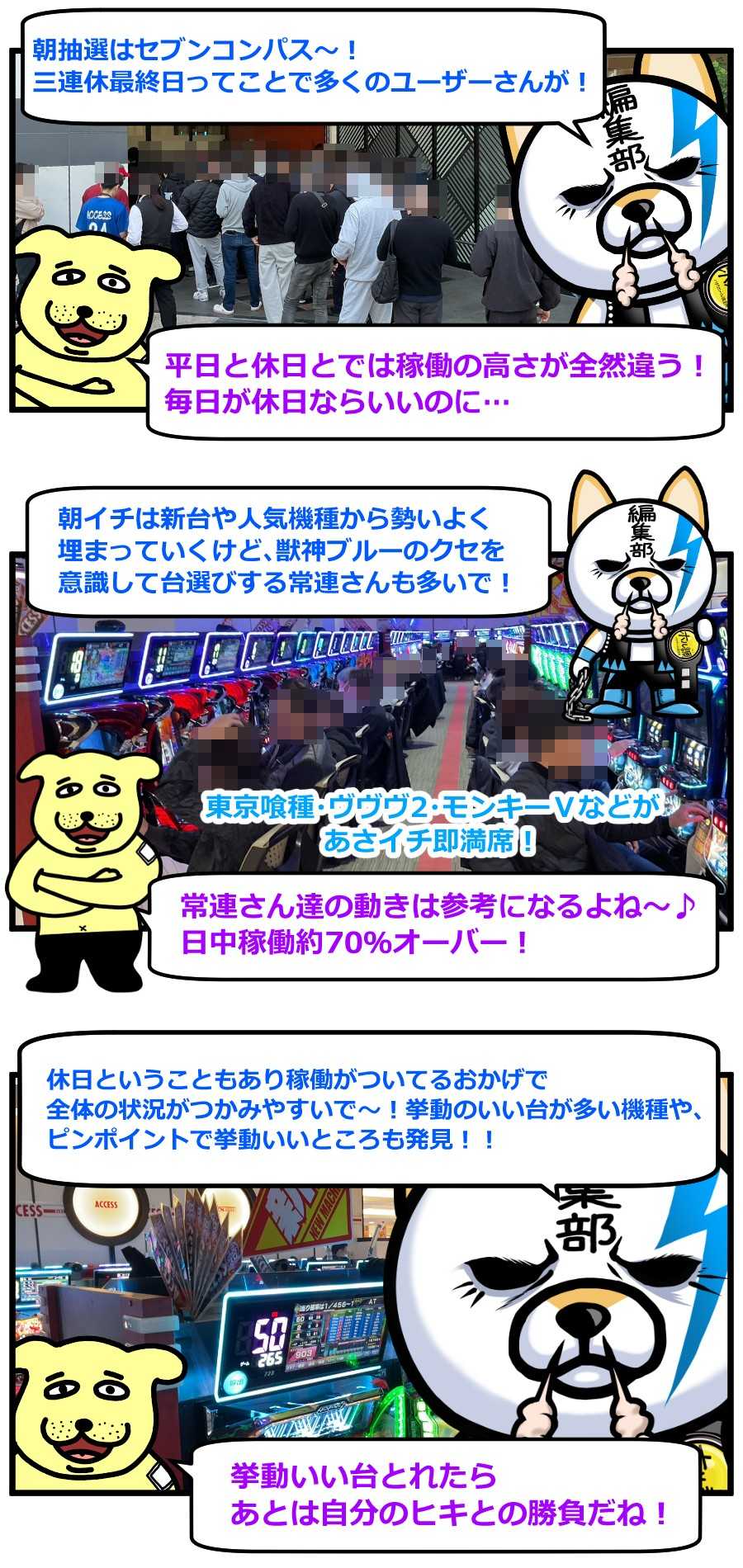| 朝並び | セブンコンパス抽選人数:88人 セブンコンパス入場人数:54人 一般入場:35人 ※1パチは入場口別で並び順になってます。 |